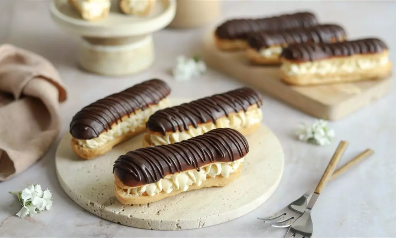 Krem stavite u poslastičarsku špric kesu sa zvezdastim nastavkom i filujte eklere kružnim pokretima dok ih ne popunite čitavom dužinom. Na svaki filovani ekler stavite poklopac sa glazurom. Eklere ohladite u frižideru i potom poslužite.