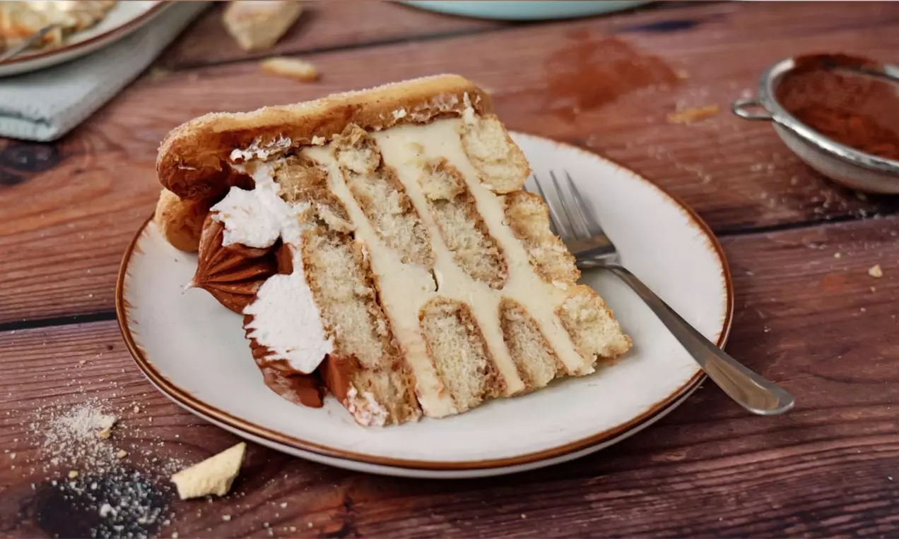 Naizmenično ih ređati dok se ne utroši sav materijal, odnosno 4 reda piškota i 3 reda fila. Poslednje će ići piškote, a preko njih kao završni sloj ide šlag. 2 kašike rasporediti celom površinom, a potom dekorisati špricem.